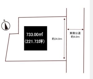 土地面積 733.00㎡ / 用途地域 無指定 / 建ぺい率 60% / 容積率 200% / 取引形態 仲介 / 地目 田 設備 電力 プロパンガス 上水道